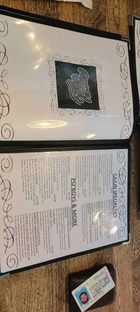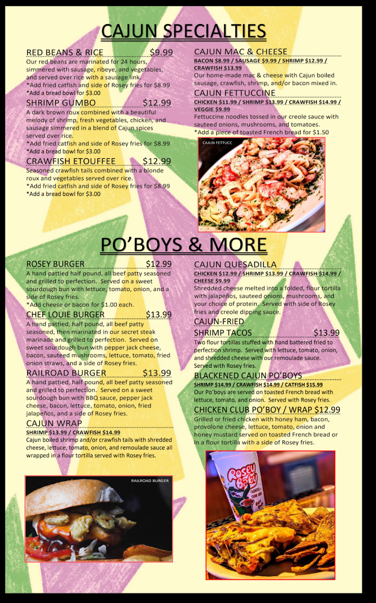 Each dish at Rosey Baby reflects the rich flavors of Southern and Cajun cuisine, with generous portions and carefully crafted flavors that promise a memorable dining experience. Whether you’re in the mood for seafood, a po’boy, or a hearty burger, this menu has something to satisfy every craving.