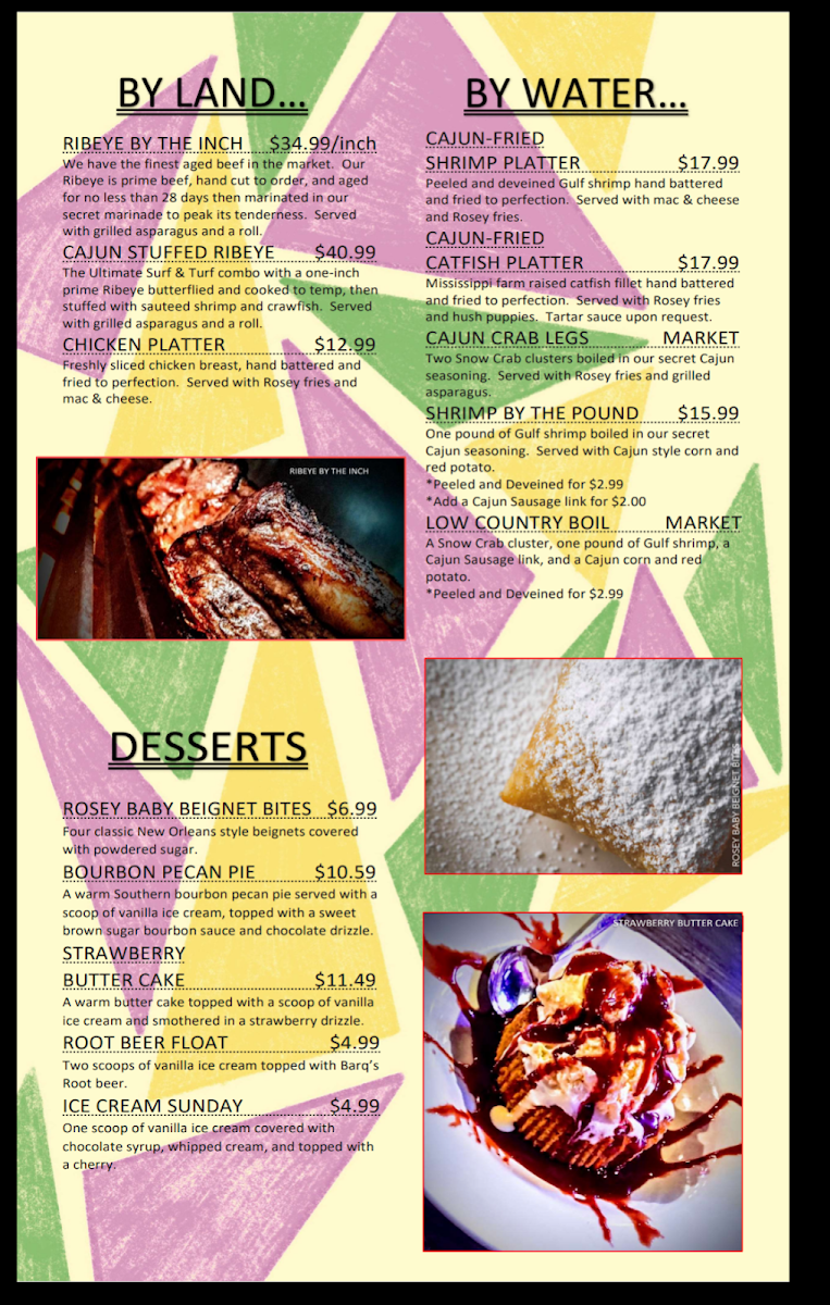 The By Land section features hearty dishes like the Cajun Stuffed Ribeye, a perfectly cooked steak stuffed with a Cajun-inspired filling, and the Chef Louie Burger, which provides a juicy, well-seasoned patty. For a more customized burger, the Rosey Burger and the Railroad Burger both stand out for their distinct flavors and satisfying portions.